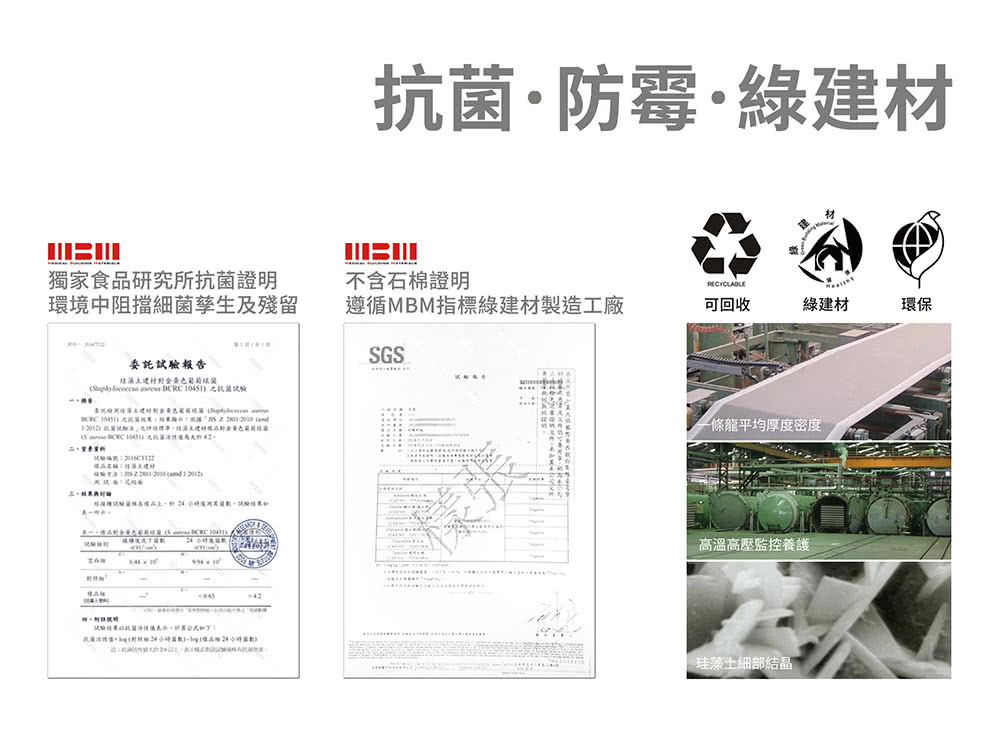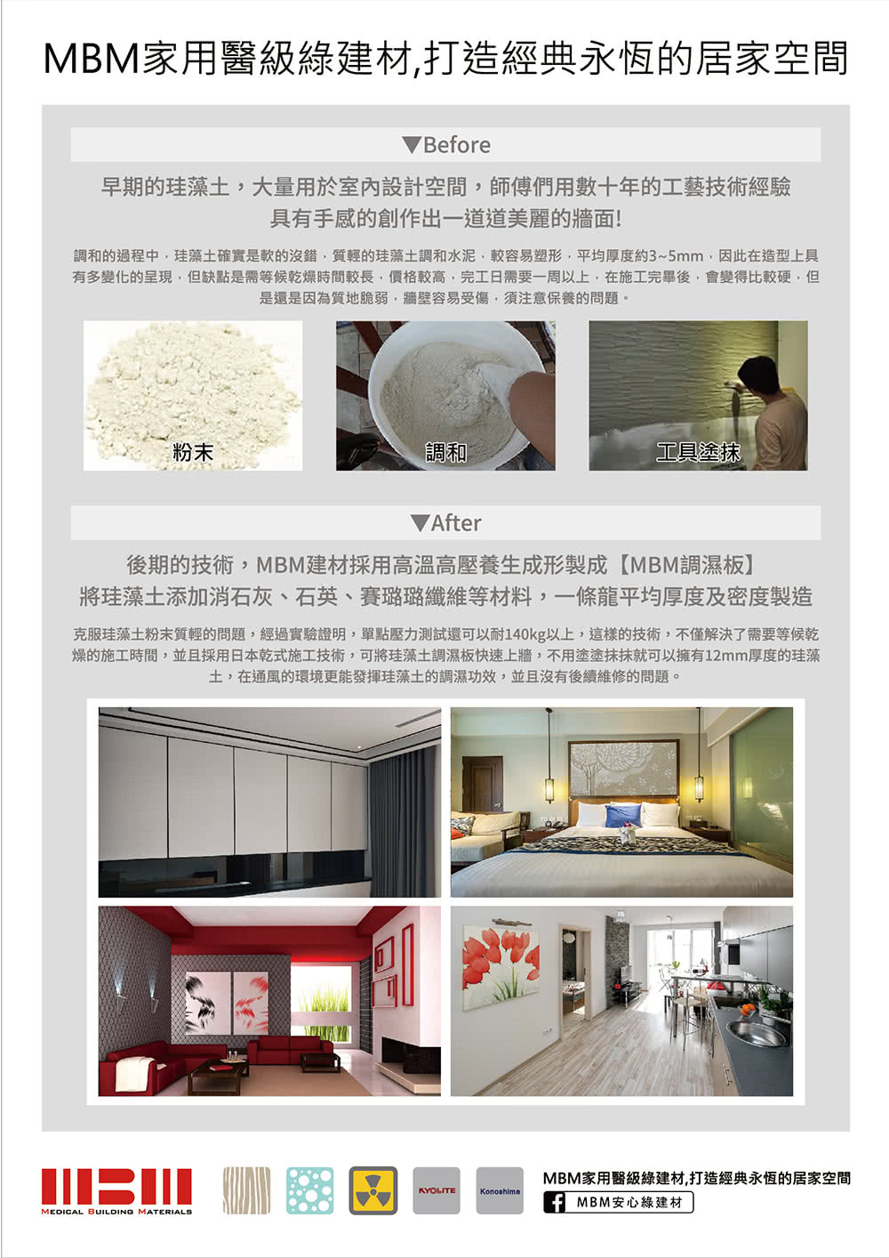MBM ( Medical building Materials ),我們以永續發展為前提,堅守新一代建材應該具備的條件, 包含:高功能性、健康安全性、實用實際性及簡易施工性,追求高CP值、特殊的功能要能符合人的健康需求, 結合日商工藝技術與台灣優良製造商,致力於建材升級及研發,為提供高端技術醫用居家建材,提高居安品質。